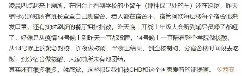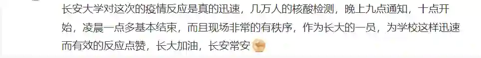 在本轮疫情面前,长安大学的学子表现出了优秀的素养。据海报新闻报道,一名长安大学渭水校区的学生透露,目前长大学生情绪都很平稳,“大家经历过之前的防疫,都很熟悉流程了,有什么事情辅导员也会及时通知。”