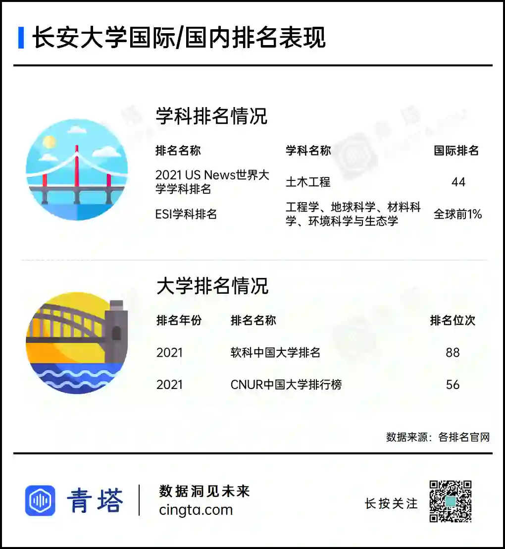 以长安大学土木与交通学科为例,在2021年US News世界大学学科排名中,长安大学土木与交通学科位列世界大学第44位,已连续两年进入世界TOP100,学科实力在全球范围内获得广泛认可。