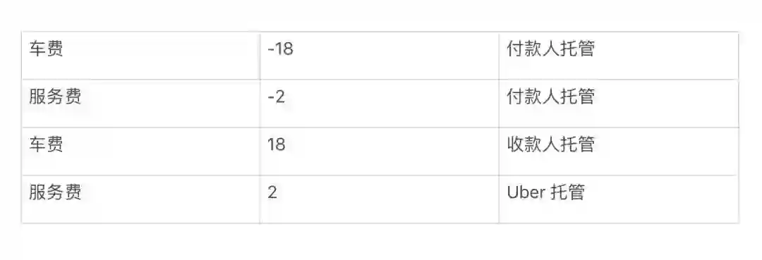 这个表格展示了一个简单的拼车旅行的示例,总票价为 20 美元,其中包括 2 美元的服务费和 18 美元的车费。所有订单条目的总和为零。