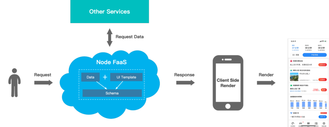 经过方案评估判断,此场景类型属于无状态服务,基于阿里云 Serverless 成熟的生态,高德最终选择接入 Node FaaS(阿里云函数计算)服务能力,出行前端搭建了场景推荐卡片服务。卡片的 UI 模版获取、数据请求聚合&逻辑处理、拼接生成 Schema 的能力均在 FaaS 层得到实现,客户端根据服务下发的 Schema 直接渲染展示,达到更加轻便灵活的目标。