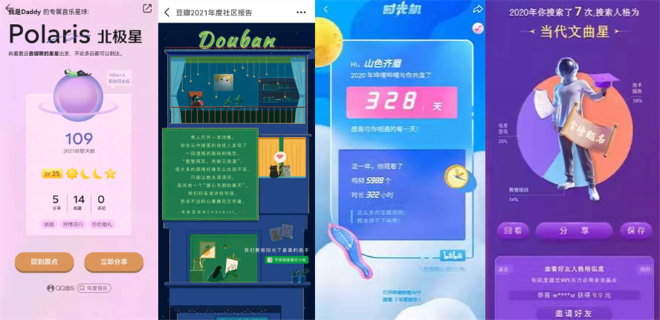 从呈现形式来看,互联网大厂几乎选择的都是H5,原因也是页面简洁、用户操作难度不高,同时方便分享;对平台而言,也容易和平台数据进行融合和提炼。当然也可辅助视频或者使用动态影集等新颖的形式,参见哔哩哔哩和小红书。