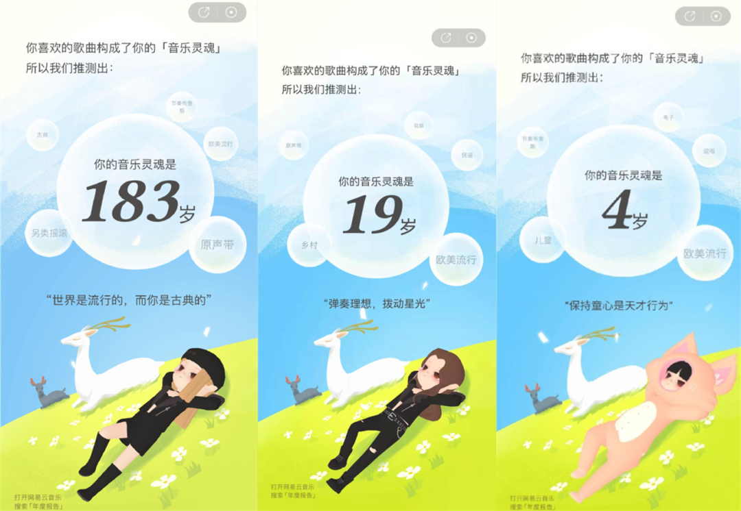 目前,在数据维度上,较为单一。以音乐类为例,一致指向注册时长、听歌数量、单曲循环最多次、曲风类型、最爱的歌手、特殊时刻(最早或最晚)等。社交类APP,分享页无论是微博、滴滴的年度人设,高德地图的年度形象,还是百度的搜索人格,都指向人物个性标签。