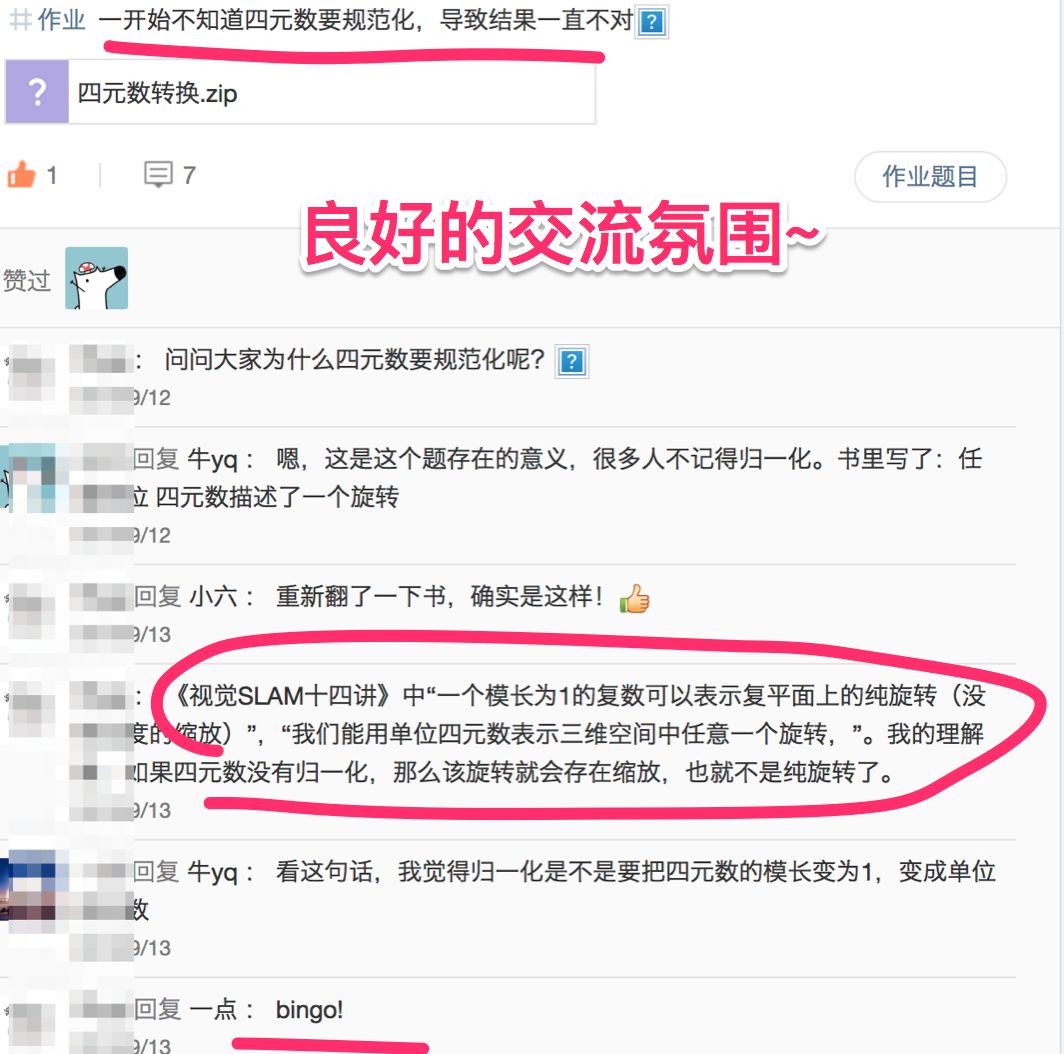 3、高质量的交流学习社区。练习题参考答案都会放到知识星球「从零开始一起学习SLAM」里,并会根据作业情况进行不定期讲解。星球内所有成员都可以进行发布问题、分享知识、上传资源、点赞、留言、赞赏、收藏等操作。而所有的交流讨论、资源分享等都可以沉淀下来并方便日后查询。遇到问题可以在星球里免费提问,星主看到后会及时答疑解惑 。