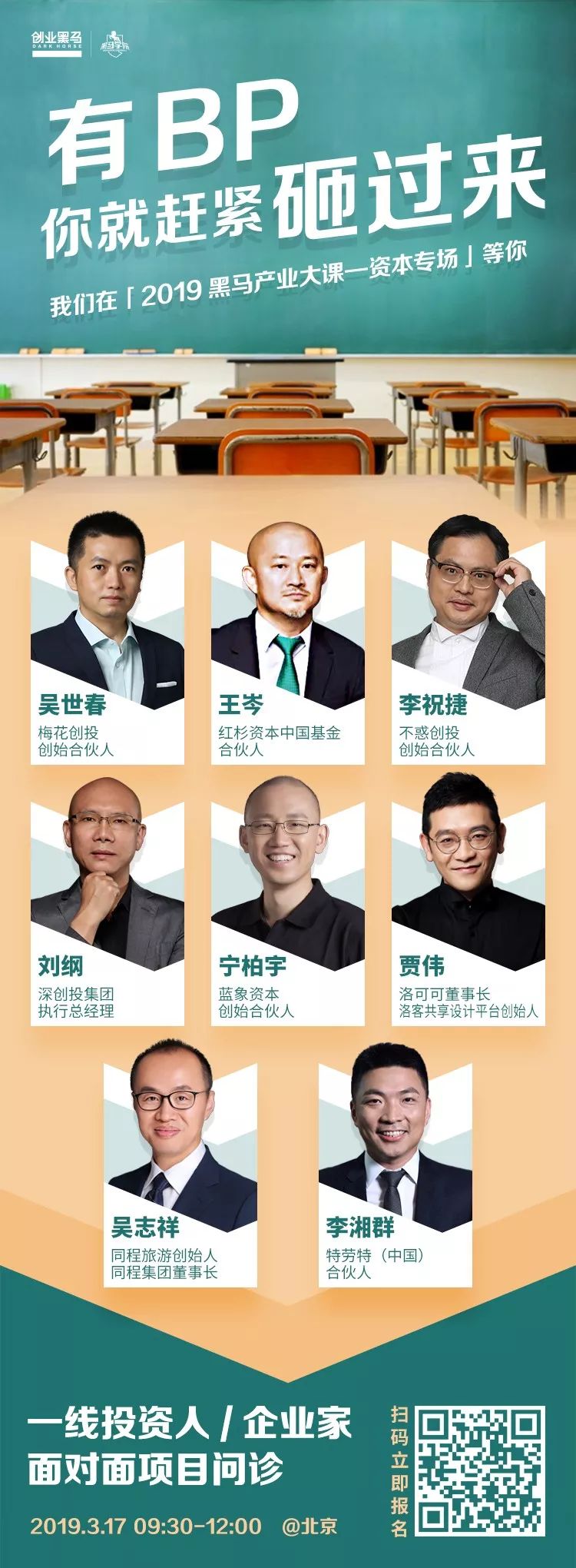 #也许你的下一轮融资就在一周之后#2019年黑马产业大课资本专场,9位一线投资人、产业升级企业家将亲临现场一对一项目问诊,每组限20人参加。率先提交BP并通过初选的项目可优先安排面谈。有BP,赶紧砸过来!