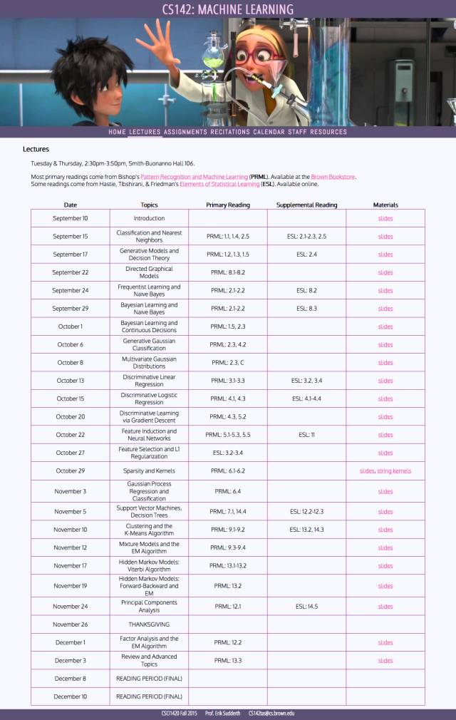 布朗大学 CSCI1420 《机器学习》 主要参考用书采用了PRML,内容安排也和PRML一致,共23课。