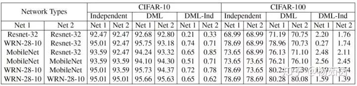 一般来说小网络从互学习训练中获益更多,比如Resnet-32和MobileNet。尽管WRN-28-10网络参数量很大,与其它网络进行互学习训练依然可以获得性能提升。因此,不同于模型蒸馏算法需要预训练大网络来帮助小网络提升性能,我们提出的深度互学习算法也可以帮助参与训练的大网络来提升其性能。