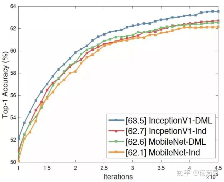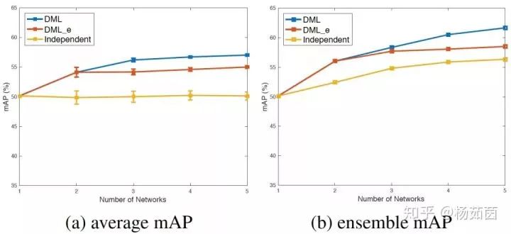 针对多网络互学习,我们从图3看出增加网络数量可以提升互学习策略下的单个网络性能,这说明更多教师网络提供了更多学习经验,帮助网络学习到更好的特征。另一方面,多网络互学习中多个独立教师(DML)的性能会优于融合教师(DML_e),这说明多个不同教师网络可以提供更多样化的学习经验,更有益于每个网络的学习。