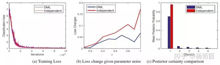 为了验证该猜想,我们对两种策略训练好的网络参数添加高斯噪声,并在图(b)中比较了添加不同方差高斯噪声后网络损失函数值的变化。从图中可以看出,单独训练的网络在添加噪声后损失函数值波动很大,而互学习训练网络的损失函数值则增加很小。该实验现象表明深度互学习算法帮助网络找到了一个更平缓的极小点,针对噪声具有更强的鲁棒性,从而具有更好的泛化性能。