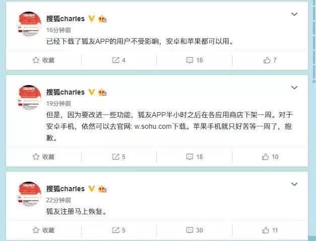 6月11日晚,搜狐CEO张朝阳宣布,狐友APP半小时之后在各应用商店下架一周。张朝阳还表示,已经下载狐友APP的用户不受影响。