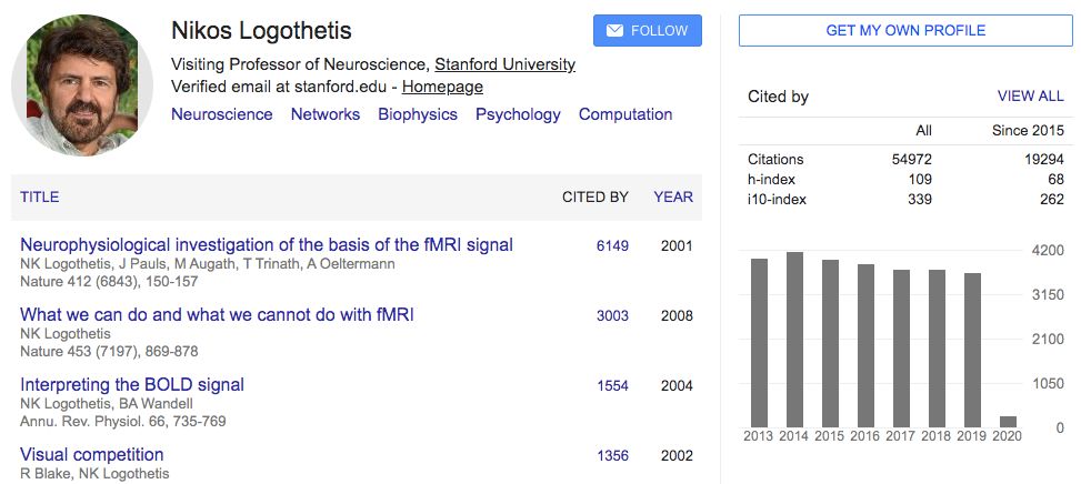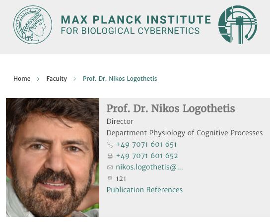 Nikos Logothetis被认为是诺贝尔奖候选人,他是马克思•普朗克生物控制论研究所所长、德国科学院院士、斯坦福大学神经科学客座教授。他获得了雅典大学的数学学士学位、塞萨洛尼基大学的生物学学士学位、和慕尼黑路德维希·马克西米利安斯大学人类神经生物学专业博士学位。