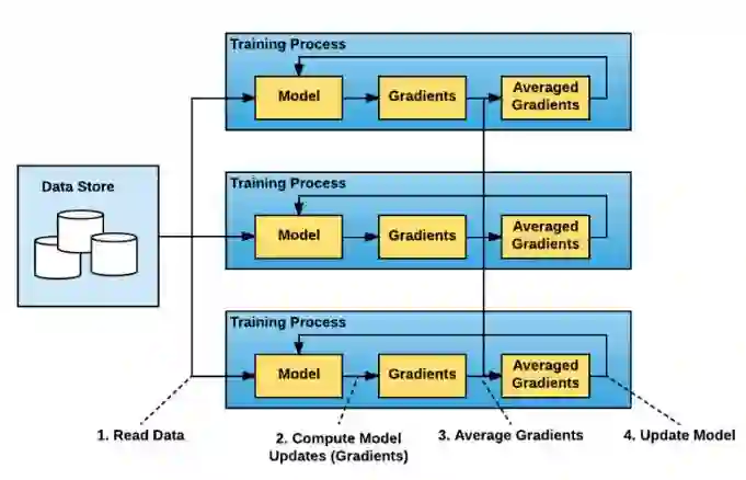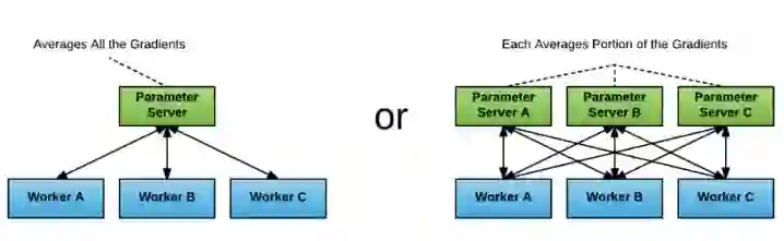 标准分布式 TensorFlow 包使用参数服务器的方法来平均梯度。在这种方法之下,每个进程都有一到两个角色:工作线程或参数服务器。工作线程处理训练数据,计算梯度,并把它们传递到参数服务器上进行平均。