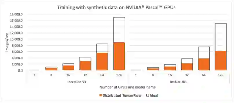 当我们使用标准 TensorFlow 基准测试套件在 128 块英伟达 Pascal GPU 上进行测试时(如图 1 所示),无论是 Inception V3 还是 ResNet-101 都浪费了将近一半 GPU 算力。