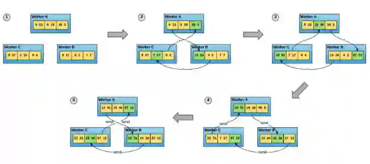 图 4. ring-allreduce 算法允许工作线程节点平均梯度并将其分散到所有节点——无需参数服务器。