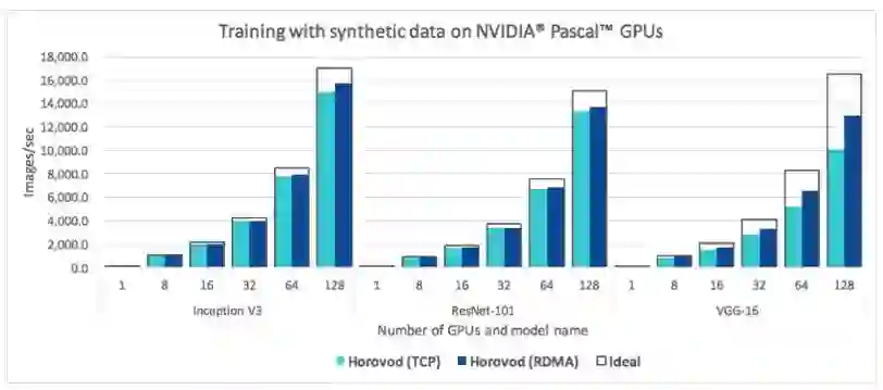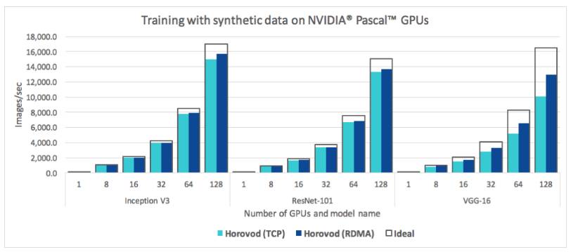图 7:Horovod 在 25GbE TCP 和 25GbE RDMA 网络上每秒处理的图像对比。它们在不同数量的 NVIDIA Pascal GPU 上为 Inception V3、ResNet-101 和 VGG-16 运行分布式训练工作。