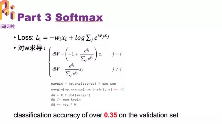 分别对 Wj 和 Wyi 求导,具体的实现代码可以观看视频回播。这个作业要求在验证集上得到大约 40% 的正确率。