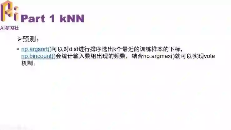 最后的一个部分是预测:np.argsort() 可以对 dist 进行排序选出 k 个最近的训练样本的下标;np.bincount() 会统计输入数组出现的频数,结合 np.argmax() 就可以实现 vote 机制。
