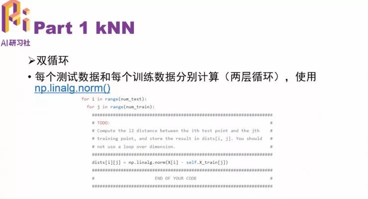 这个作业主要分为三步,第一步用双循环实现 kNN, 双循环就是对每个测试数据和每个训练数据分别计算,第一层循环就是对测试数据的循环,第二层循环是对训练