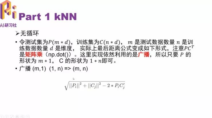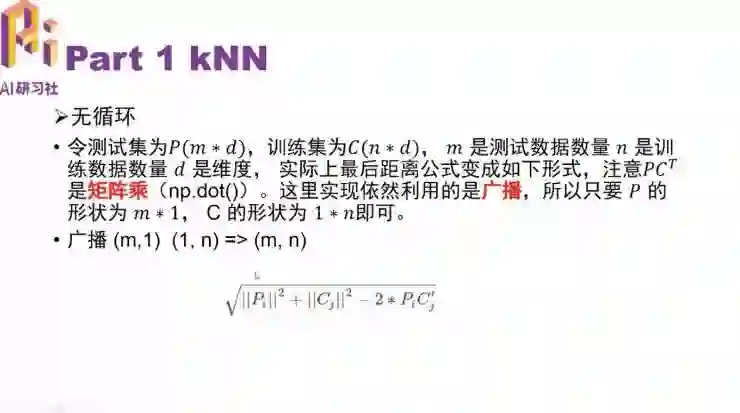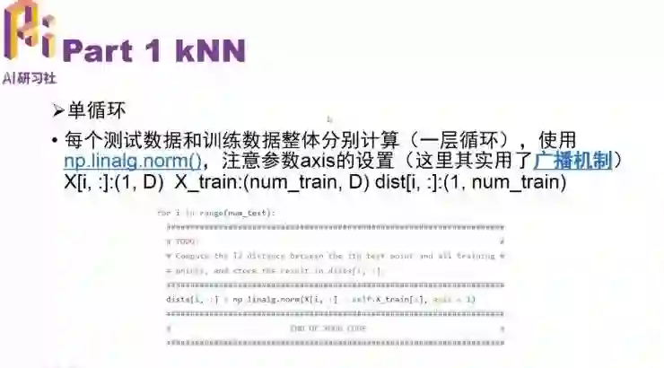 下面使用单循环实现。单循环要求每个测试数据通过一次计算就可以得到和训练数据整体的距离。训练分为两个部分,首先是每个测试数据和训练数据做差,需要注意参数 axis 的设置,用了广播机制。