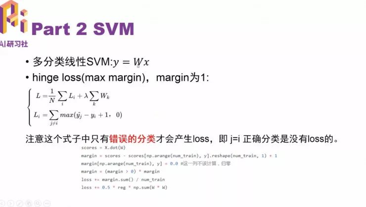 推导 SVM 过程很复杂,这里不涉及过多问题,用线性计算就可以了。注意下面这个式子汇总只有错误的分类才能产生 loss。即 j=i 正确分类是没有 loss 的。