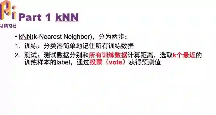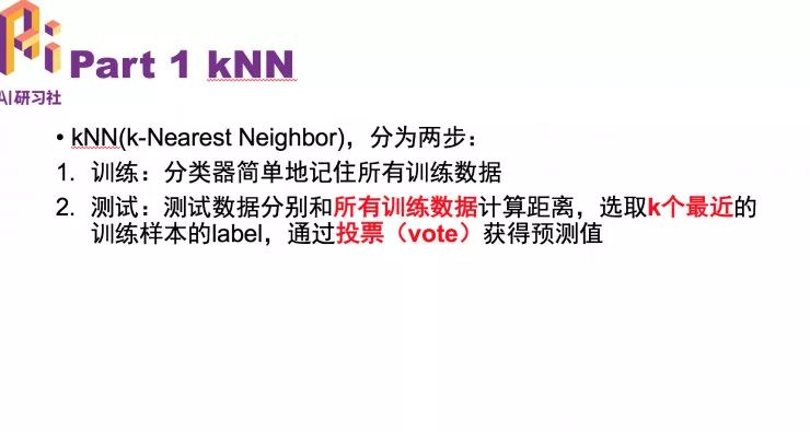 第二步是测试,比第一步要重要。每一个测试样本要和每一个训练数据分别计算距离,选取 k 个最近的训练样本的 label,通过投票机制获得预测值。