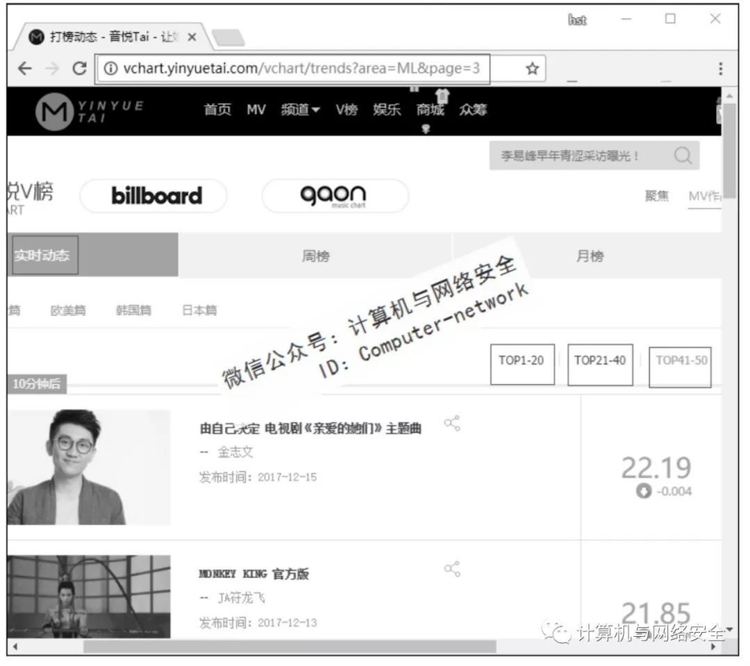 以音悦台网站为目标,在音悦台中获取实时动态的音乐榜单。音悦台中的实时动态榜单有5个,这里只爬内地篇的榜单,如图1所示。