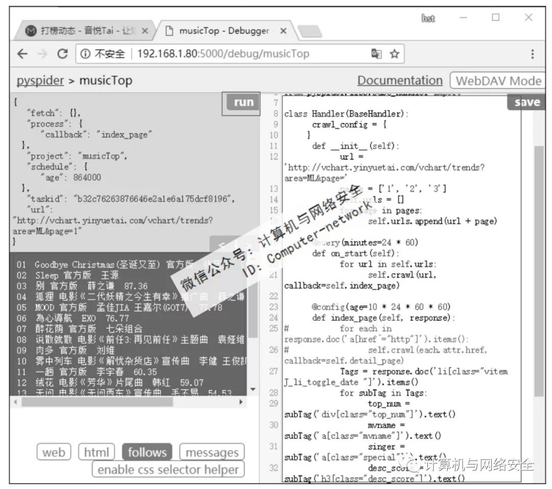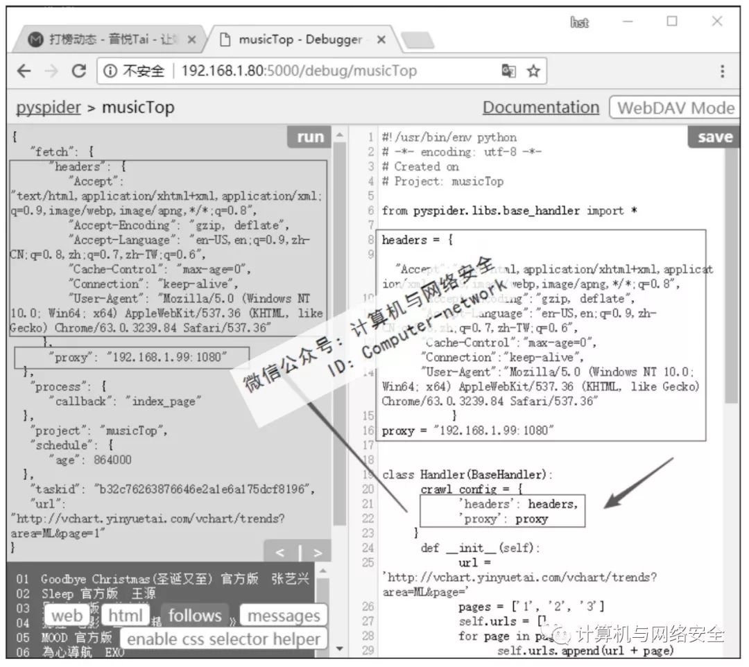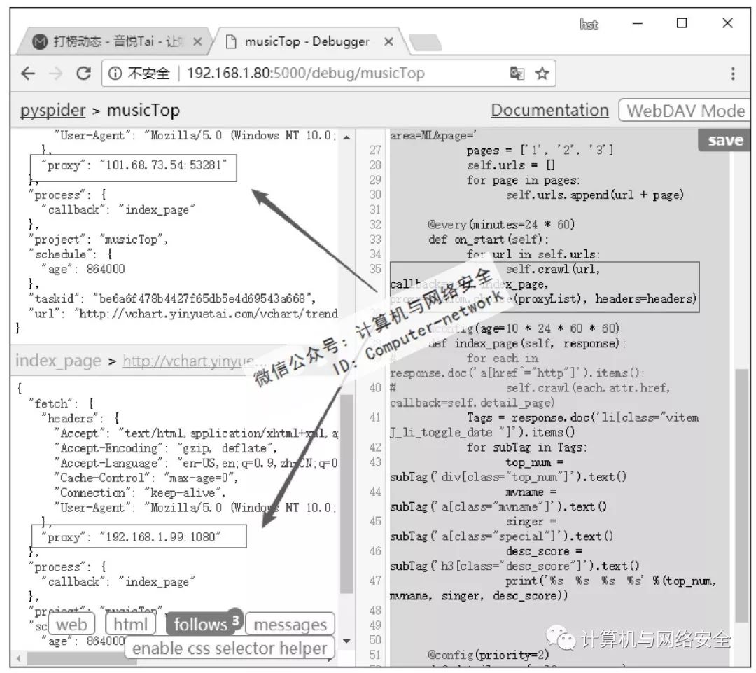在浏览器中可以打开页面而爬虫无法得到数据,一般加载headers就可以解决问题了。浏览器需要使用proxy才能打开的页面,爬虫也需要加载proxy才能得到数据。如果网站中设置了反爬虫,过滤频繁发送请求的IP的情况下怎么办呢?正常的应对方法是使用多个代理服务器进行轮询。通过网络搜索得到为Pyspider加载多个代理的方法是使用squid轮询。这种方法是可以,但需要安装squid软件,而且squid设置起来也比较麻烦。这里采用更加简单的方法,只要在爬虫发送请求的部位,随机地从代理池中挑选一个代理就可以了(按顺序挑选也可以,这就相当于代理的轮询了)。因此,爬虫最终版本omega版的代码如下: