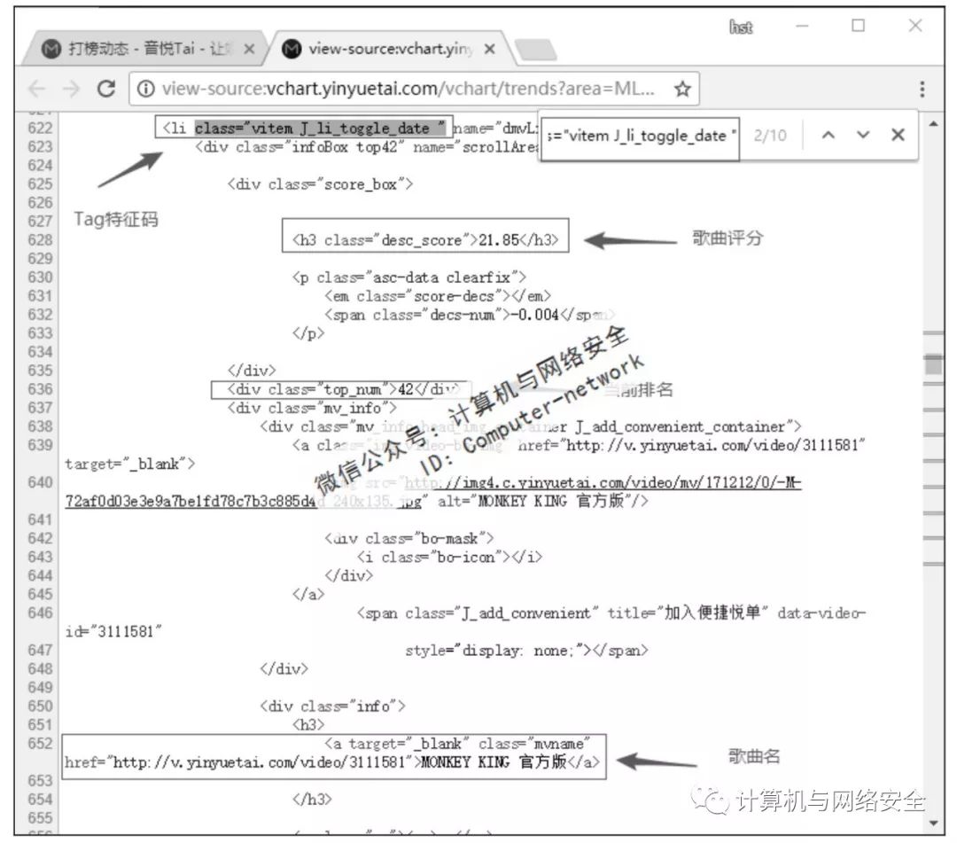从图1中可以看出,这个实时的榜单有3页,共50首歌曲。只需要获取当前榜单的歌曲名、歌手名、评分以及当前排名就可以了。打开页面编码,找到所需数据的位置,如图2所示。