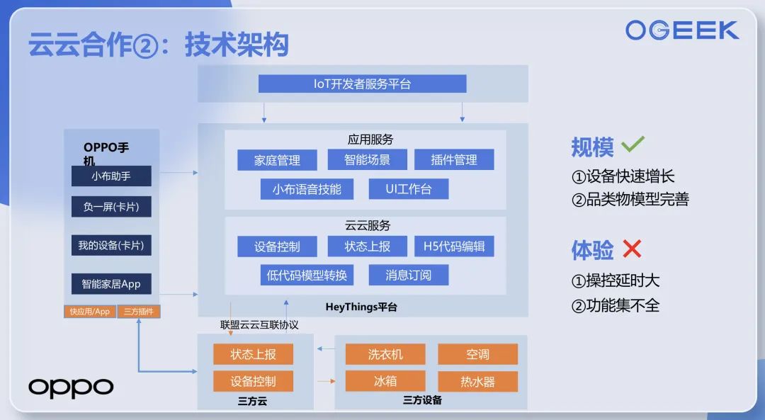 OPPO 智能物联云技术总监夏舰波:OPPO 和美的、VIVO 一起制定了 Heythings 云云对接协议,在此基础上我们扩展支持了海信、中移动、创维、奥克斯等 IoT 厂商的设备。通过云云对接的方式,OPPO 手机可以操控更多智能家居。同时 OPPO 是 CSA 联盟和 OLA 联盟的重要成员,积极参与 matter 标准和 OLA 标准智能家居协议的制定和推进。ColorOS 13 开始支持了 matter 设备的发现和操控。