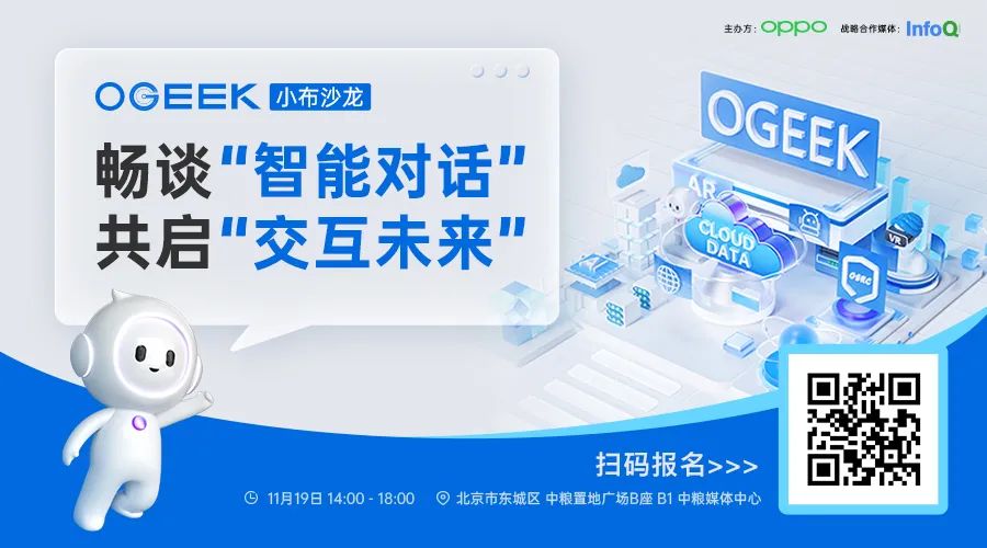 “OGeek Day”是由 OPPO 数智工程系统主办的行业技术沙龙品牌,旨在为技术爱好者搭建一个技术交流和分享的开放平台。沙龙主要围绕“科技为人、以善天下”的技术理念,聚焦于为智能终端提供安全高效的数据、算力、算法、云服务方面的前沿技术,打造技术互动的行业生态,探索技术在行业应用的实践、突破及未来发展方向。2022 年 11 月 19 日,OGeek 小布沙龙将落地北京东城区 中粮置地广场,以《畅谈“智能对话”,共启“交互未来”》为主题,与众多开发者共同探讨智能对话的演进方向,探索人机交互的精彩未来。扫描下方海报二维码即刻报名↓