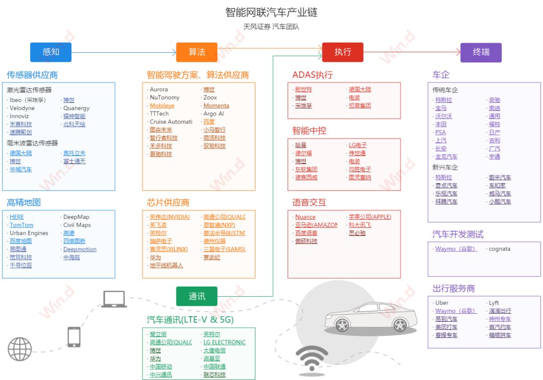 行业分析以上,建议重点关注V2X领域的四维图新(高精度地图)、千方科技(国内领先的智能交通运营服务商和大交通数据服务商)、易华录(RFID芯片)、金溢科技(ETC设备)等,其他无人驾驶标的包括德赛西威等。