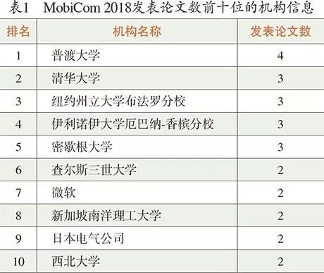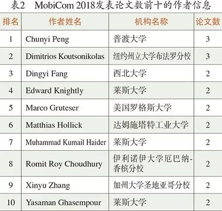 “Author Statistics”统计了几个时间段各作者在MobiCom会议上发表论文数量。表2展示了2018年排名前十的作者及论文发表数量。