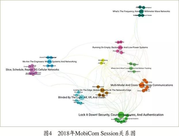 AceMap对MobiCom会议官方分类的10个单元(session)进行了整理与分析,画出了各个单元之间的关系图,如图4所示。