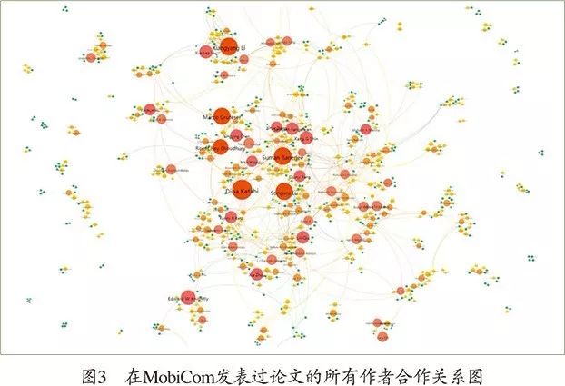 AceMap分别对2018年在MobiCom上发表论文的作者以及所有在MobiCom上发表过论文的作者画了关系图,如图3所示。其中,点的大小代表论文数的多少。点之间的连线代表合著者之间的关系。