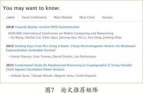 AceMap从五个维度对每篇论文进行了相似论文推荐,形成论文推荐矩阵。这些维度包括最新、同会议、最相关、被引用数最多和导读类论文。例如,针对美国伊利诺伊大学香槟分校的Anadi Chaman等撰写的论文“Ghostbuster: Detecting the Presence of Hidden Eavesdroppers”,AceMap实现的论文推荐矩阵如图7所示。这种多维度推荐方式能够满足不同用户的不同需求
