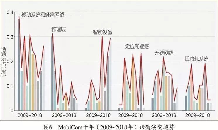 AceMap还提取了MobiCom2009~2018十年的摘要信息,利用词向量算法将关键词映射到向量空间进行聚类。对每一个聚类赋予相应的话题,总体上分为六大类,如图6所示。横轴代表年份,纵轴代表话题所占比例,从中可以看到六大话题十年间的演变趋势。