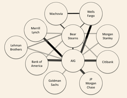 各个机构之间的连线代表他们的关联,连线越粗越越深,关联就越强。AIG处在关系网的一个中心位置,很多金融机构购买了AIG提供的资产保险,如果他们资产的价值下降,AIG会给他们兜底。