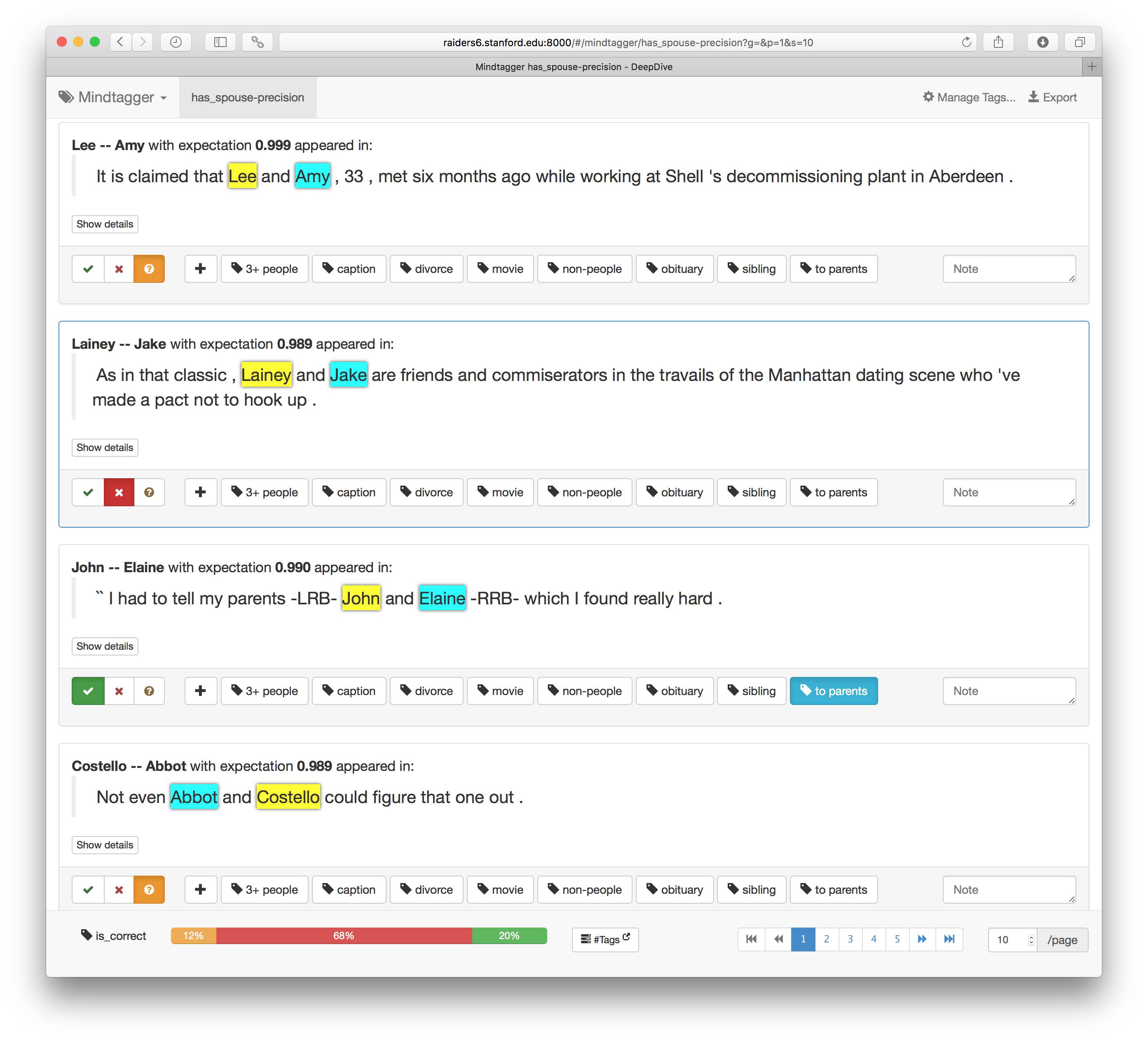 Screenshot of Mindtagger precision task in progress