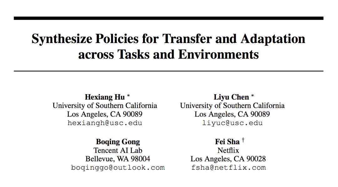 本文是由南加州大学和腾讯 AI Lab 合作发表于 NeurIPS 2018 的 Spotlight 论文之一,这项工作研究了同时在不同环境(Env)和不同任务(Task)之间迁移的问题,目的是利用稀疏的(Env, Task)组合就能学到在所有可能组合中迁移的能力。