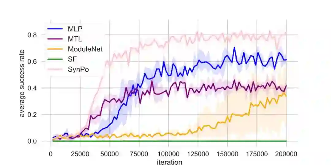 如下图所示,我们的方法(SynPo)成功的超过了最近提出的几个方法,包括多任务神经网络(MTL),模块化神经网络(ModuleNet),专门用于迁移学习的 SF,还有一个我们自己方法的简化版(MLP)。