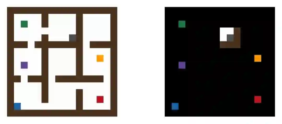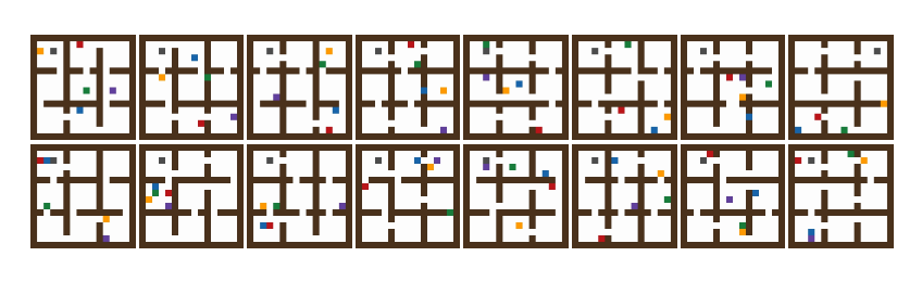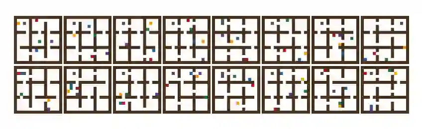 上图展示了 16 个不同的迷宫(环境),其中红黄绿紫等颜色方块代表不同宝藏——它们各自代表一个任务,同时收集它们的不同顺序又能定义新的任务。
