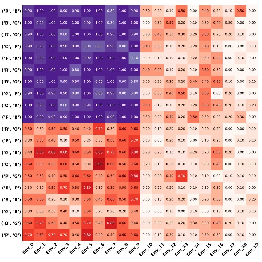 最后,我们给出在 10 个环境和 10 个任务组合上训练,然后在 20 个环境和 20 个任务上做测试的结果。如下图所示,每一行代表一个任务,每一列代表一个环境,其中左上角的 10 个环境和任务是用于训练的。