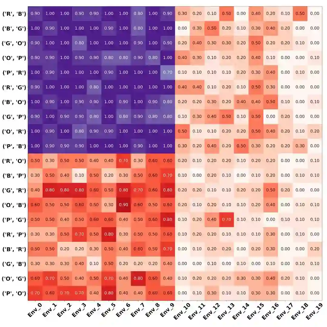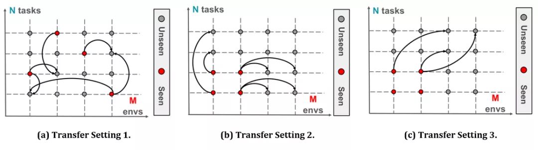 如上图所示,红色代表训练阶段见到的环境与任务组合,灰色代表只在测试阶段才会见到的组合: