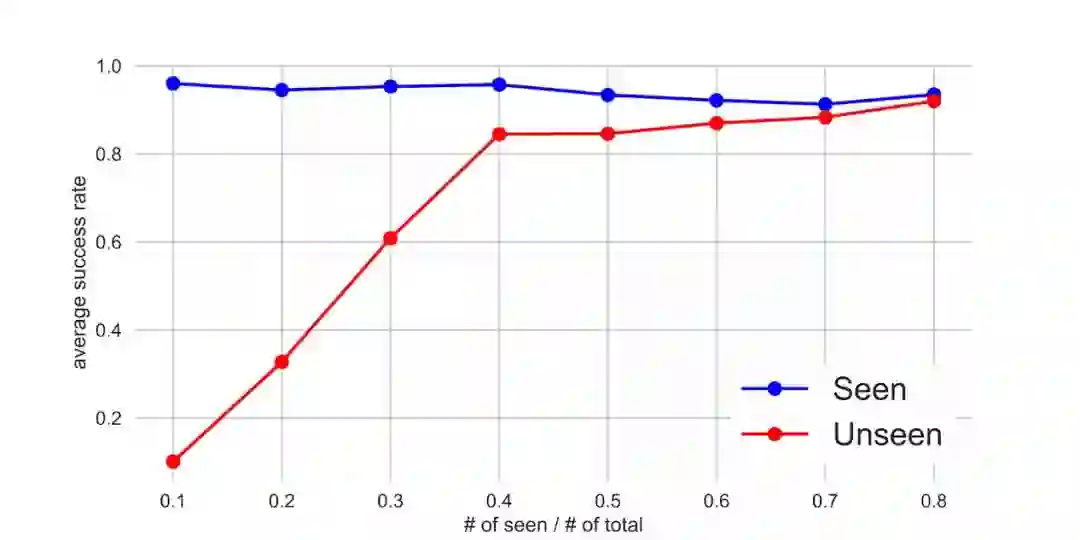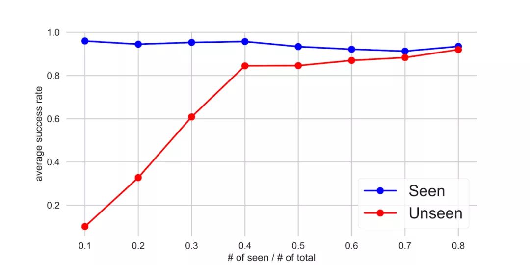 另外,我们也分别研究了智能体在见过和没见过的(环境、任务)组合上的表现。如下图所示,对于智能体在训练阶段见过的组合,它在测试阶段始终表现不错;对于没见过的组合,它只需要在 40% 的组合上学习,就能达到很好的效果。