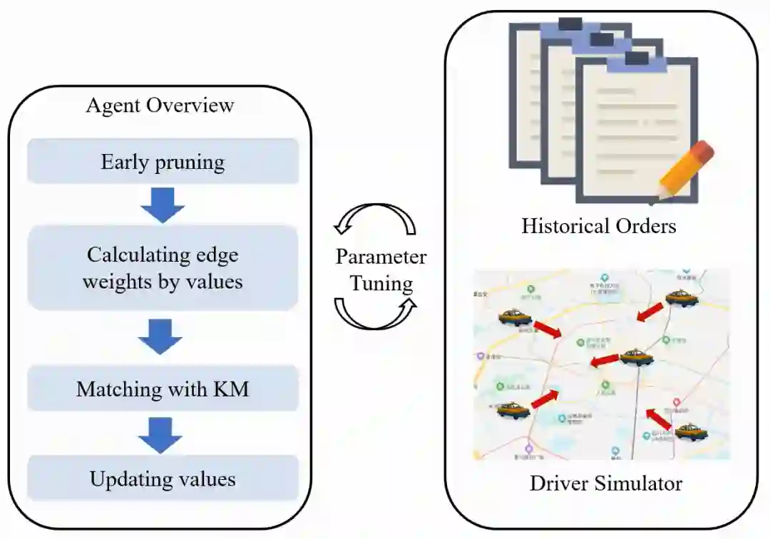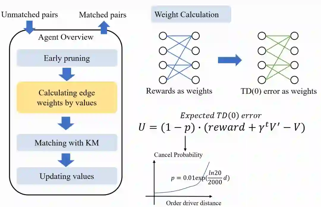 例如,该方法 将单智能体作为智能“调度中心” ,车辆发出调度请求后,“调度中心”进行全局运力调度。结合此前在大规模时空预测中的经验,进一步对研究区域进行筛选并自定义了一个N×N的网格,将全局信息(整个城市订单、车辆、价值的时空分布)和局部信息(车辆当前位置等)作为state。采用了一个经过剪枝的全局action space, 防止车辆陷入局部最优 。