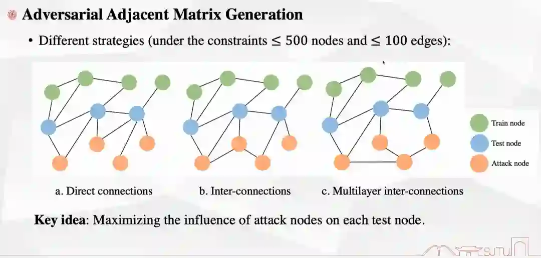 攻击方案包含两个步骤,第一步是对抗邻接矩阵生成,第二步是增强特征梯度攻击。其中,第一步基于图数据的拓扑性质,从而可以实现更加一般的攻击,并且仅需要一次生成,在大规模图的攻击上更加高效;第二步会训练一个替代模型作为目标,这里利用了攻击可迁移性,使用的训练方法是对对抗损失进行反向传播,并使用Adadelta优化器。