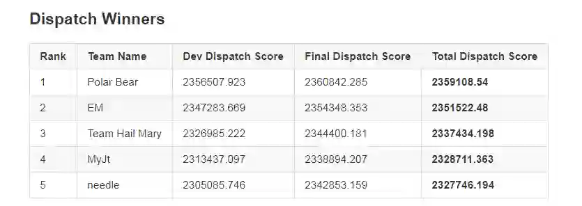为了最大化平台上所有司机日均收入,在计算每个订单的收益时,北航联合第四范式团队采用基于强化学习的方法,不仅能考虑当前时刻的收入,还能兼顾未来可能的收益。同时,结合剪枝与C++实现的高效二分图匹配算法,能够在2秒的规定时限内,及时找到合适的订单分配方案,保证乘客的用户体验。最终团队以2359108.54的高分在Dispatch任务上夺冠。