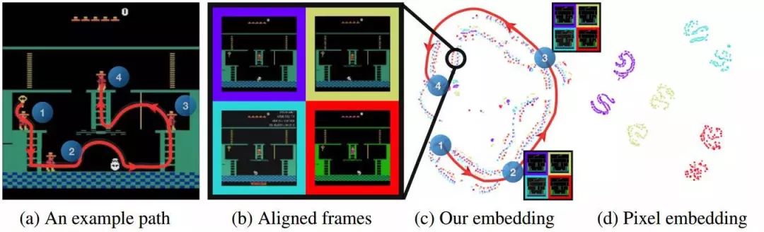 图2:对于(a)中所示的路径,使用(c)我们的嵌入与(d)原始像素形成的观察序列的t-SNE投影。在(b)中,四个不同的域在(b)中并排进行比较,以获得《蒙特祖玛的复仇》中的样本框架:(紫色)Atari学习环境,(青/黄)两个YouTube训练视频,以及(红色)未观看的YouTube视频。很显然,尽管(紫色)和(红色)在训练期间被搁置在一边,但在我们的嵌入空间中所有四条轨迹都很好地对齐。使用原始的像素值无法实现任何有意义的对齐。