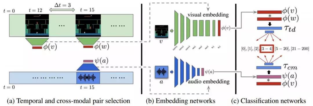 为了解决这些局限性,本文提出了一种新方法,用以克服多个演示中观察序列之间的域差距,通过使用在时间(时间距离分类)和模态(跨模态时间距离分类)上构建的自监督分类任务来学习一个通用的表征(见图2)。与以前的方法不同,我们的方法既不需要(a)演示之间的逐帧对齐(frame-by-frame alignment),也不需要(b)类标签或其他注释,而这些类标签或注释可能是从一个对齐中间接推断出来的。我们还提出了一种新的度量(循环一致性)来评估这种已学习嵌入的质量。