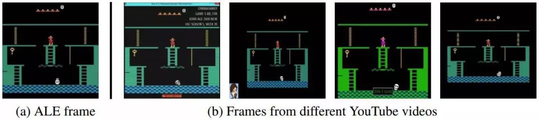 图1:Atari学习环境与YouTube视频之间存在的域差距的图示,我们的智能体可以通过这些视频学习如何玩《蒙特祖玛的复仇》。请注意不同的尺寸、分辨率、宽高比、颜色以及文字和头像等视觉工件的添加。