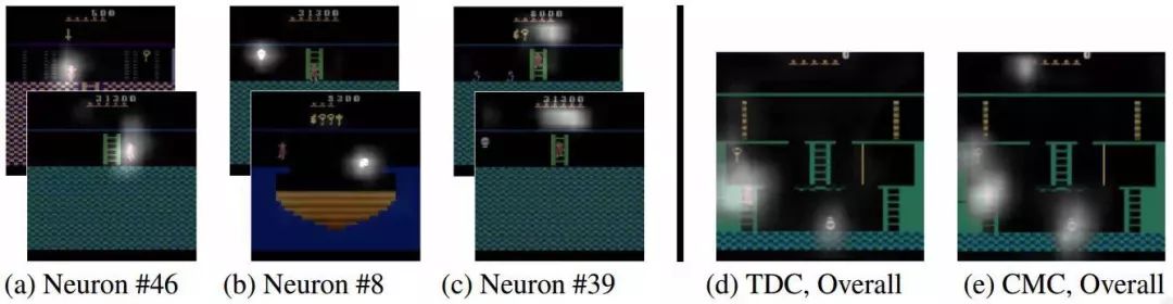 图4:(左)最后的卷积层中选择激活的可视化。单个神经元集中在例如(a)玩家、(b)敌人、和(c)库存。值得注意的是,不存在与干扰物或特定工件相关的激活。(右)在最后一层的所有渠道中对激活进行的总结式可视化。